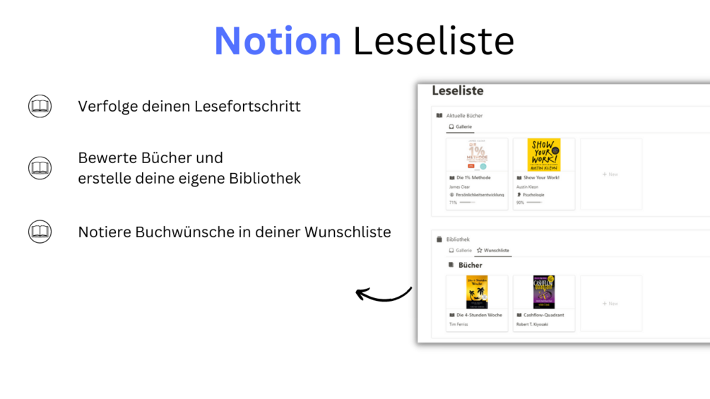 Möchtest du eine Liste mit Büchern erstellen, die du unbedingt lesen möchtest? Kein Problem! Mit der Notion Leseliste/Buchtracker kannst du ganz einfach Wunschlisten erstellen und verwalten. So verlierst du nie wieder den Überblick über die Bücher, die du unbedingt lesen möchtest.