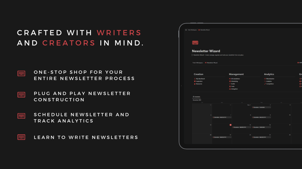 Newsletter Wizard is an all-in-one Newsletter writing system that lets you craft, manage, and grow your newsletter from one place with ease.